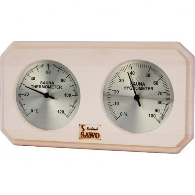 Термогигрометр 221-THА от компании Sawo имеет оригинальную прямоугольную форму с фигурными углами. В широкой рамке из древесины осины находится два круглых окошка. Под стеклом каждого окошка расположен графичный циферблат. Один из них - это гигрометр, который с точностью измерит уровень влажности в парной, другой - термометр, который сообщит о температуре воздуха. Данный прибор прекрасно подойдёт для использования в любом парильном помещении. В нашем интернет-магазине представлен широкий ассортимент измерительных приборов в корпусах из разных видов древесины.